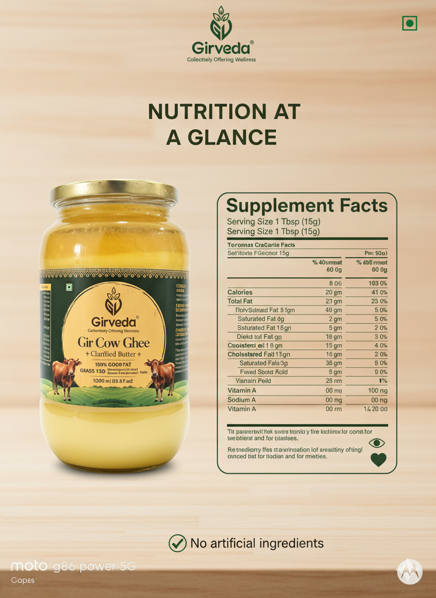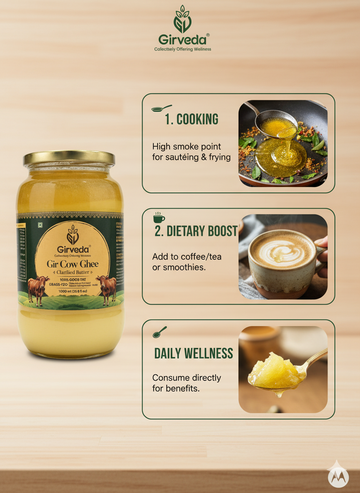 Our ghee is 100% natural, grass-fed, and free from preservatives, chemicals, and additives. The golden richness of Girveda Ghee enhances your cooking, supports digestion, boosts immunity, and adds divine flavor to every meal.