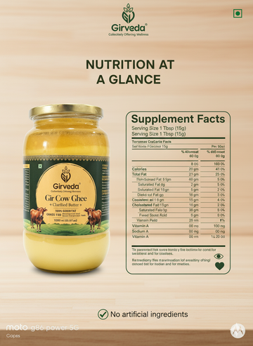 Experience the purity of tradition with Girveda Gir Cow Ghee, made from the milk of grass-fed indigenous Gir cows. Handcrafted using the ancient Bilona method, this clarified butter is rich in good fats, Vitamin A, and Omega-3, ensuring wellness in every spoonful.