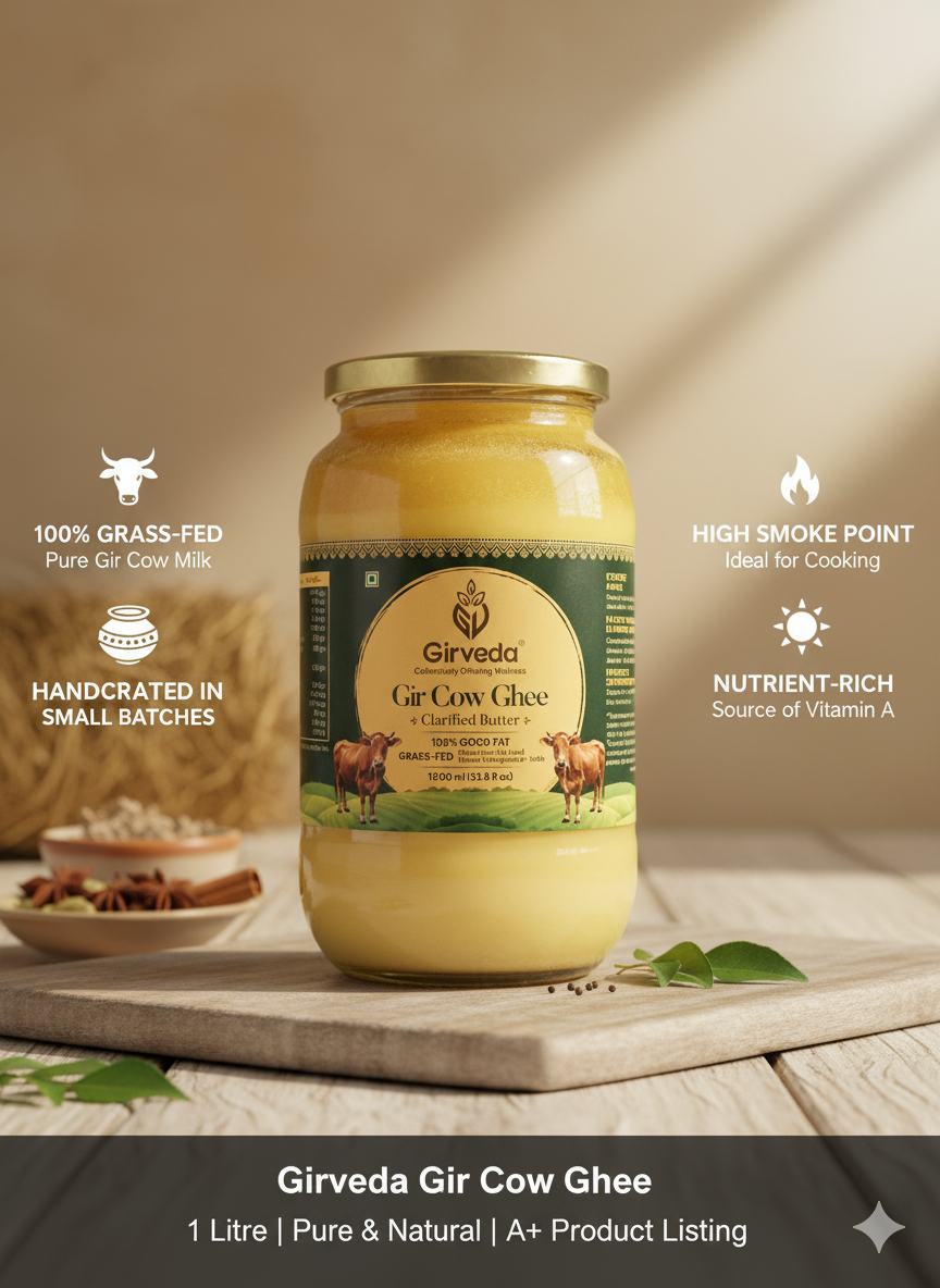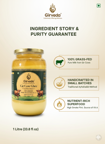 Girveda Gir Cow Ghee is a wholesome superfood from the sacred land of Gir-Somnath, Gujarat — home to the purest Gir cows of India. Crafted the traditional way in small batches, Girveda preserves natural aroma, color, and taste while ensuring the highest nutritional quality.