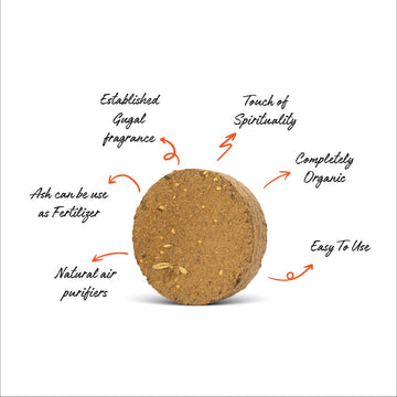 Handcrafted with devotion and purity, these charcoal-free dhoop tikkis are made from the sacred base of Gir Cow’s Desi Dung, Cow’s Ghee, and Gozaran, enriched with Gugal (Myrrh), Agarwood, Sandalwood, Honey, Foxtail Millet, and other Ayurvedic herbs.